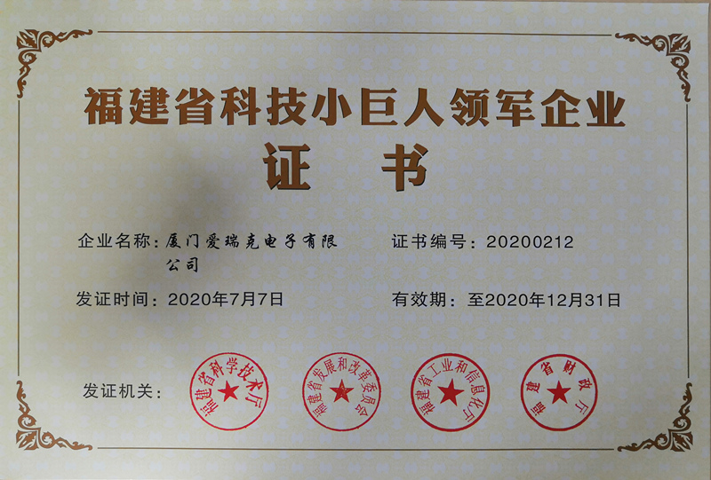 熱烈祝賀廈門愛瑞克電子有限公司在2020年7月27日獲得福建省科技小巨人領(lǐng)軍企業(yè)證書